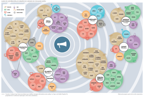 En el caso de la radio son la Cadena Ser, la COPE, Uniprex (Ondacero) y Radiocat XXI (RAC 1) quienes deciden lo que escucha el 80% de la audiencia total de la radio española y controlan el 97% del mercado. No se conocen los datos referentes a la prensa escrita, más allá de que su distribución ha bajado 4,2 a 2,3 millones de copias por día en los últimos 15 años y que la circulación media de periódicos en España es de las más bajas de la UE.