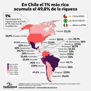 Destaca el caso de Chile, con una riqueza muy concentrada en el 1% de la población ultrarrica, que controla el 49,8% del total, mientras que el 50% más pobre tiene un déficit del -0,6% que denota extrema pobreza.