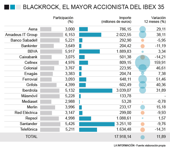 Amadeus IT Group, Banco Sabadell, Iberdrola, Másmóvil, Santander y Telefónica.¿Por qué se les considera a BlackRock y Vanguard dueños del mundo?